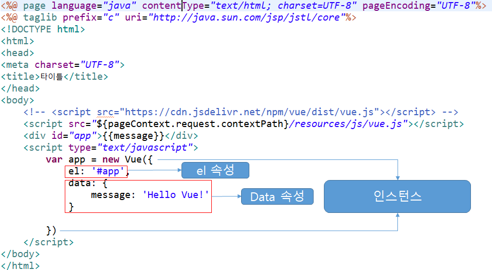 - 인스턴스의 유효 범위는 el 속성으로 지정한 <div id="app"> 태그 아래에 오는 요소들로 제한된다.
